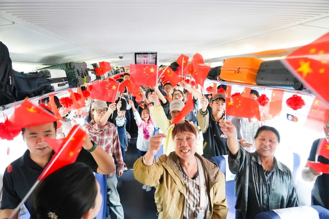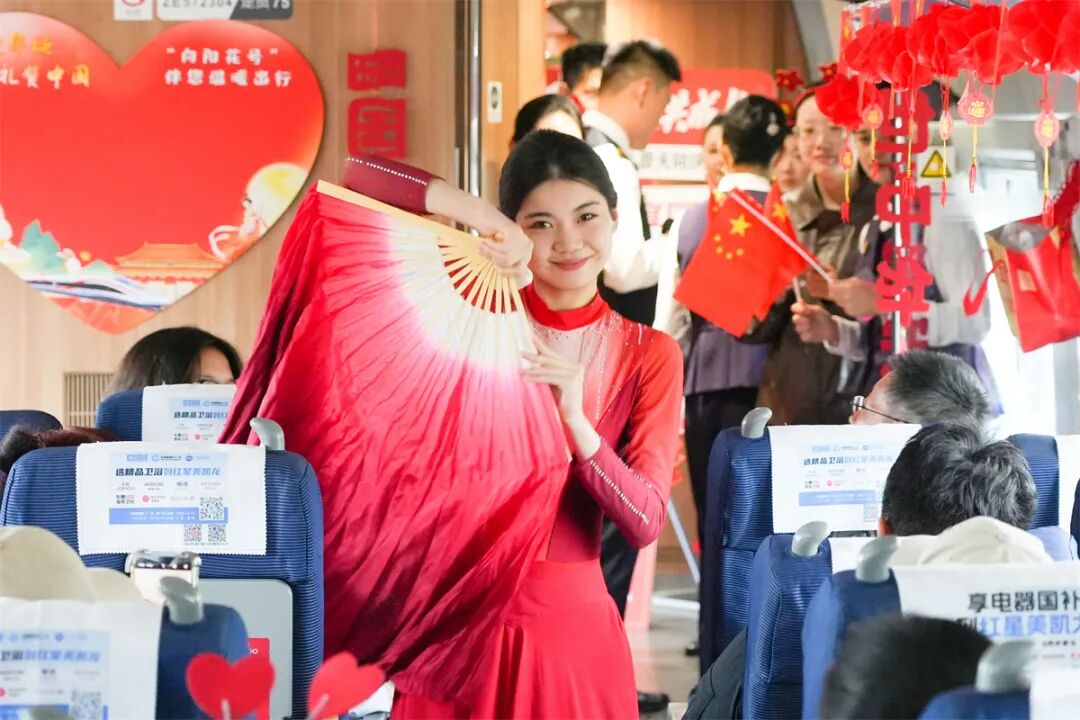 車廂內(nèi)掛滿條幅、彩帶和中國(guó)結(jié),洋溢著節(jié)日的喜慶氛圍。在舞蹈《親愛(ài)的你啊》的優(yōu)美旋律中,列車聯(lián)歡拉開序幕。