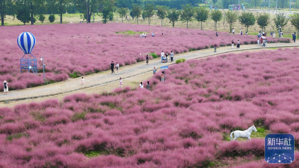 ↑ 10月5日,人們在南京八卦洲陌上花渡游玩(無人機(jī)照片)。新華社發(fā)(蘇陽攝)