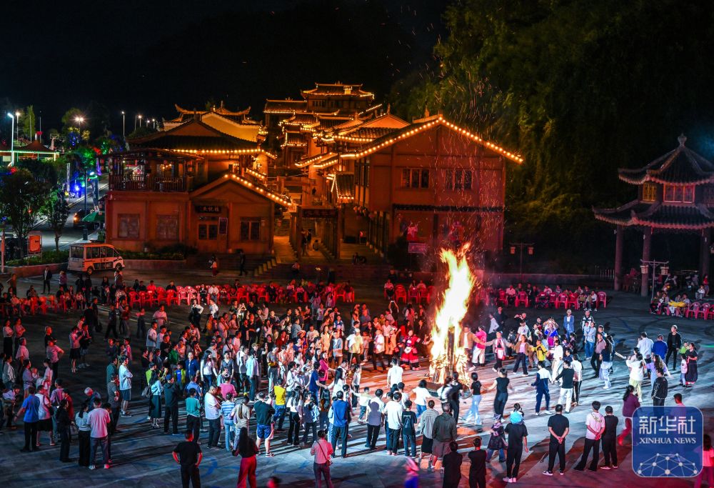 ↑ 10月5日晚,在貴州省晴隆縣阿妹戚托小鎮(zhèn),游客與當(dāng)?shù)厝罕妵艋鸸参?。新華社記者 楊文斌 攝
