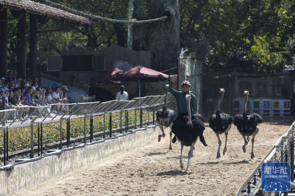 ↑ 10月6日,人們在上海野生動(dòng)物園觀看奔跑中的鴕鳥。新華社記者 王翔 攝