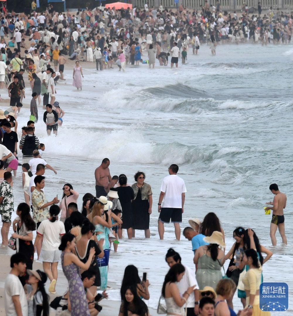 ↑ 10月6日,在海南省三亞市大東海景區(qū),市民和游客在海灘戲水。新華社記者 趙穎全 攝