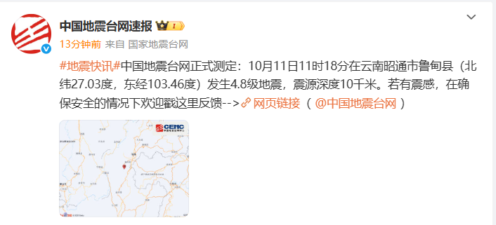 中國地震臺網(wǎng)正式測定:10月11日11時18分在云南昭通市魯?shù)榭h(北緯27.03度,東經(jīng)103.46度)發(fā)生4.8級地震,震源深度10千米。