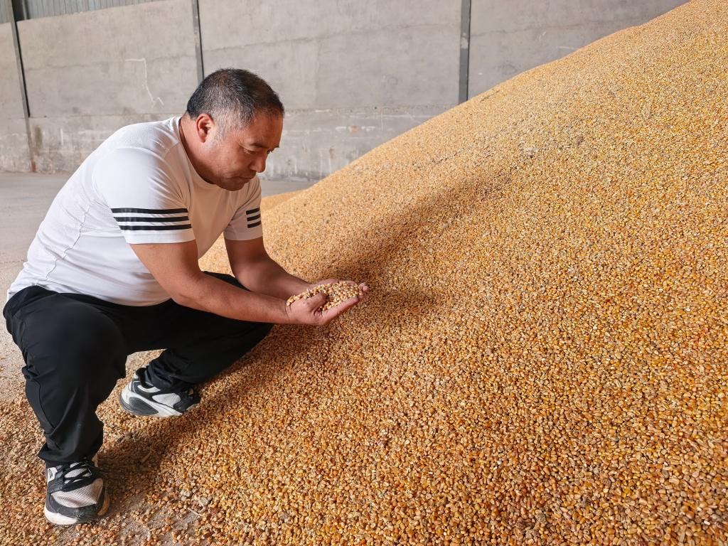 2025年10月10日,在安徽省宿州市蕭縣劉套鎮(zhèn),三大家村黨總支書記高杰查看剛烘好的玉米。新華社記者 水金辰 攝
