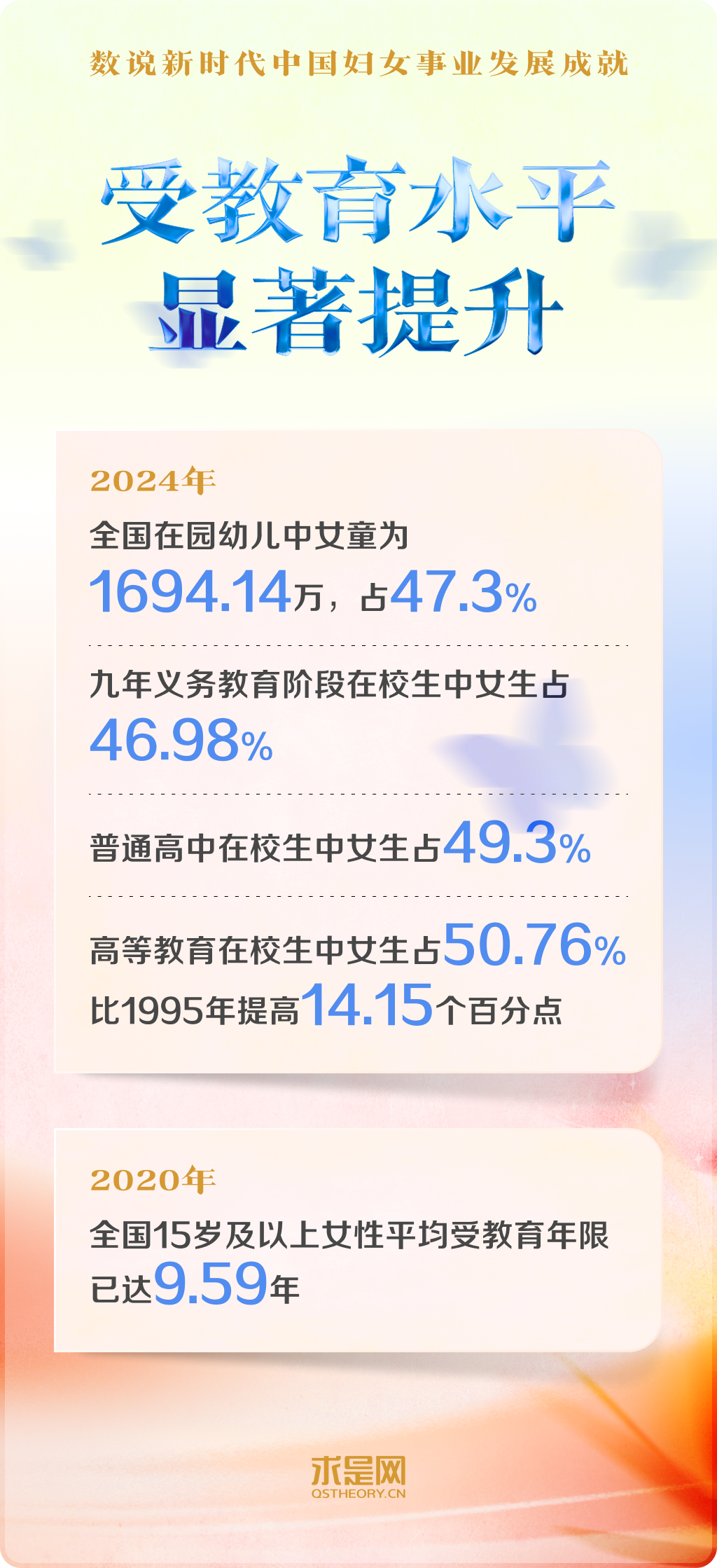 黨的十八大以來,以習(xí)近平同志為核心的黨中央把保障婦女合法權(quán)益、促進(jìn)男女平等和婦女全面發(fā)展,作為中國式現(xiàn)代化的重要內(nèi)容,對婦女事業(yè)發(fā)展作出一系列開創(chuàng)性、全局性、長遠(yuǎn)性的重大決策部署。中國在幼有所育、學(xué)有所教、勞有所得、病有所醫(yī)、老有所養(yǎng)、住有所居、弱有所扶上持續(xù)用力,不斷實(shí)現(xiàn)廣大婦女對美好生活的向往。一組組數(shù)字,記錄下新時代中國婦女事業(yè)跨越式發(fā)展的重大成就。