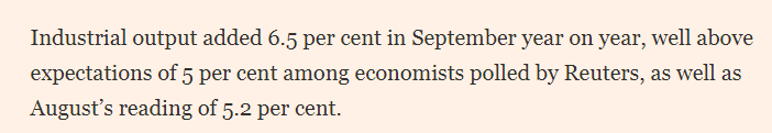 英國《金融時報》的文章分析說,9月規(guī)模以上工業(yè)增加值同比增長6.5%,顯著高于路透社調查經濟學家預期的5%及8月的5.2%。荷蘭國際集團(ING)經濟學家分析稱,超預期表現主要源于外需拉動。文章說,上周,海關數據顯示,中國出口保持韌性,9月同比增長8.3%,對東南亞等地區(qū)出口持續(xù)增長。
