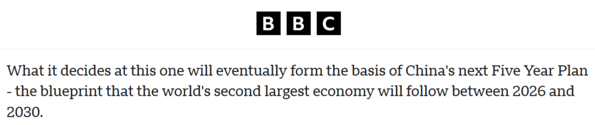 10月20日至23日,黨的二十屆四中全會在北京舉行。對此,英國廣播公司(BBC)19日報道認(rèn)為,“此次會議所作的決定最終將成為中國下一個五年規(guī)劃的基礎(chǔ),而這一規(guī)劃將指引世界第二大經(jīng)濟體在2026年至2030年期間的發(fā)展方向”。