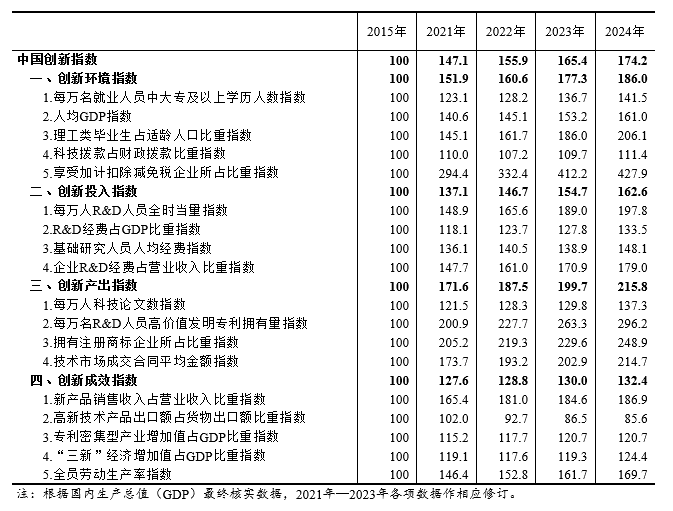 根據(jù)國(guó)家統(tǒng)計(jì)局社科文司《中國(guó)創(chuàng)新指數(shù)研究》課題組測(cè)算,2024年中國(guó)創(chuàng)新指數(shù)為174.2(以2015年為100),比上年增長(zhǎng)5.3%[1]。分領(lǐng)域看,創(chuàng)新環(huán)境指數(shù)、創(chuàng)新投入指數(shù)、創(chuàng)新產(chǎn)出指數(shù)和創(chuàng)新成效指數(shù)分別為186.0、162.6、215.8和132.4,分別比上年增長(zhǎng)4.9%、5.1%、8.1%和1.9%。結(jié)果表明,2024年中國(guó)創(chuàng)新指數(shù)保持穩(wěn)步增長(zhǎng),我國(guó)科技創(chuàng)新能力持續(xù)提升,創(chuàng)新產(chǎn)出較快增長(zhǎng),發(fā)展新動(dòng)能不斷壯大,為經(jīng)濟(jì)高質(zhì)量發(fā)展提供有力支撐。