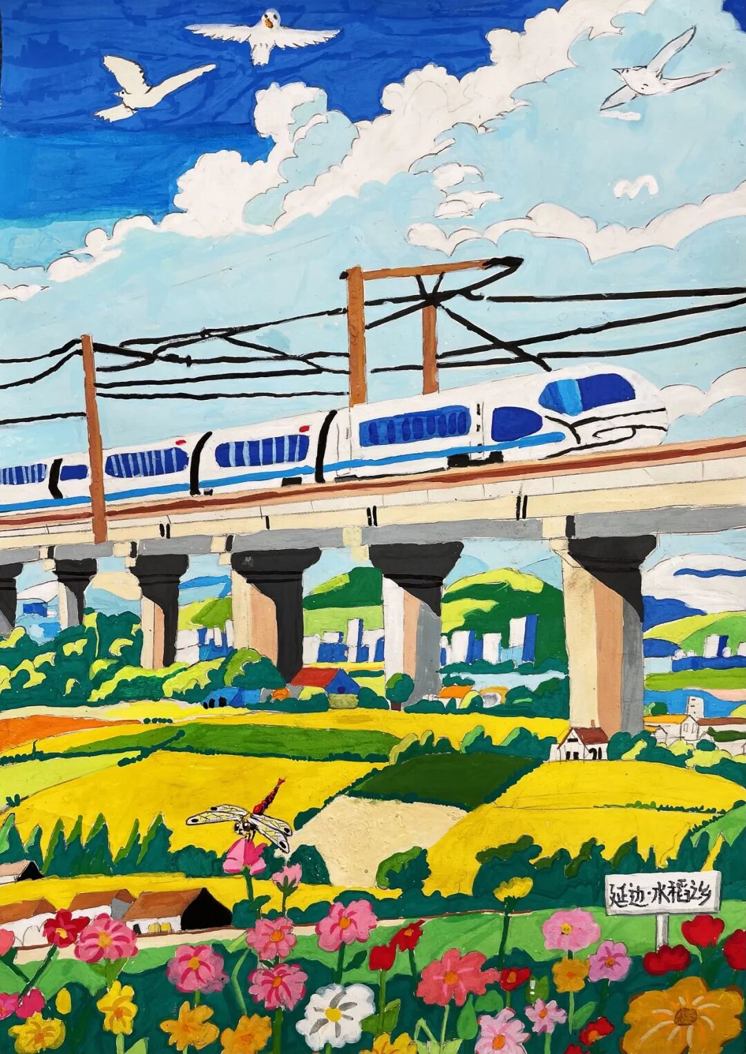 不遠處徐鹽高鐵上,銀白色的高鐵像一道流星劃過水鄉(xiāng)。我的鉛筆在本子上沙沙作響,把窗外的景色畫下來:成片的藕田里,粉白的荷花搖曳生姿;戴著斗笠的農(nóng)民在稻田里忙碌,身后的水渠泛著粼粼波光。列車員阿姨推著小推車走來,“瓜子飲料礦泉水”的吆喝聲,和車輪與鋼軌的碰撞聲交織在一起,成為獨屬于旅途的音樂。