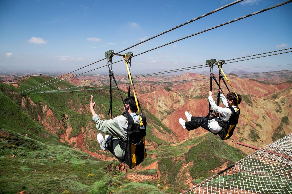 游客在蘭州水墨丹霞旅游景區(qū)體驗(yàn)玻璃漂流項(xiàng)目。新華社記者 郎兵兵 攝
