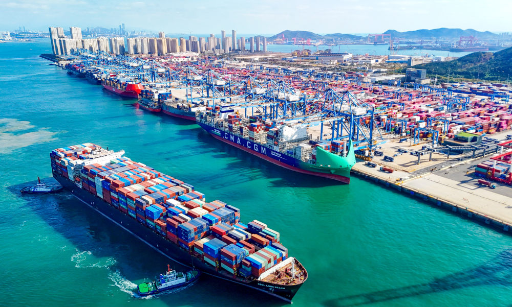 一艘貨輪滿載貨物駛出青島自貿(mào)片區(qū)(2025年11月5日攝,無人機(jī)照片)。新華社發(fā)(張進(jìn)剛攝)