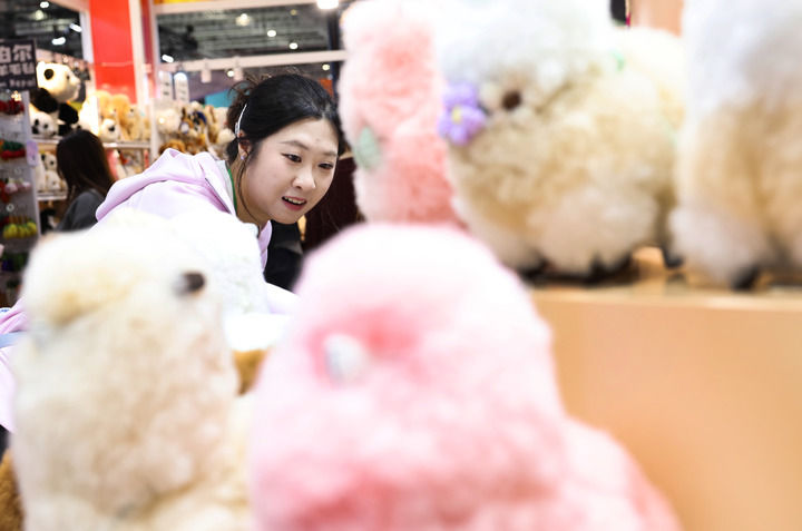 2025年11月8日,在第八屆進博會消費品展區(qū),參觀者在秘魯溫暖駝品牌的羊駝毛制品前駐足觀看。新華社記者 方喆 攝