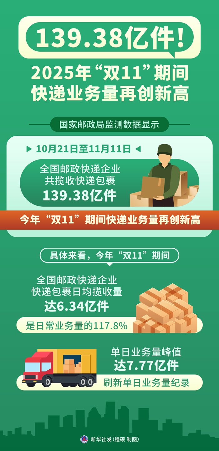 具體來看,今年“雙11”期間,全國郵政快遞企業(yè)快遞包裹日均攬收量達6.34億件,是日常業(yè)務(wù)量的117.8%;單日業(yè)務(wù)量峰值達7.77億件,刷新單日業(yè)務(wù)量紀錄。
