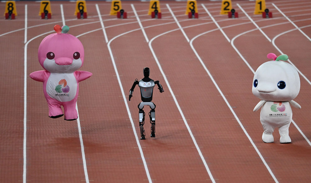 11月17日,在田徑項目賽事開始前的暖場活動中,機器人和吉祥物喜洋洋、樂融融在廣東奧體中心體育場賽跑。新華社記者 周牧 攝
