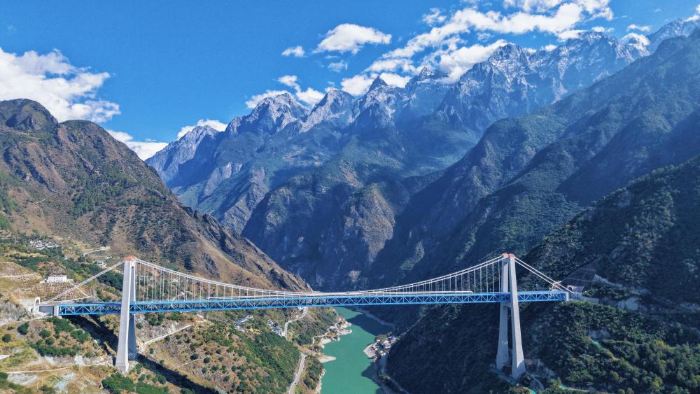 這是11月21日拍攝的虎跳峽金沙江鐵路大橋。大橋全長882.5米,起于玉龍雪山隧道出口,止于哈巴雪山隧道進(jìn)口,是麗香鐵路的重點(diǎn)控制性工程(無人機(jī)照片)。