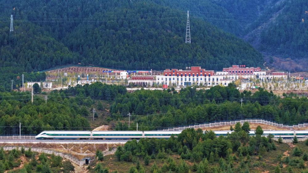 11月21日,一列動(dòng)車組列車駛過云南迪慶藏族自治州小中甸站(無人機(jī)照片)。
