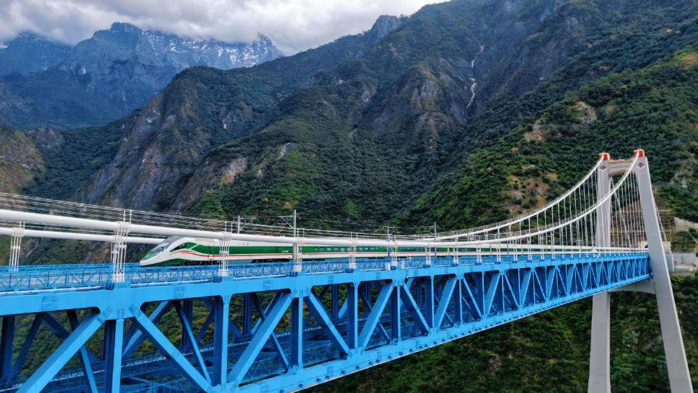 11月21日,動(dòng)車組列車通過虎跳峽金沙江鐵路大橋(無人機(jī)照片)。