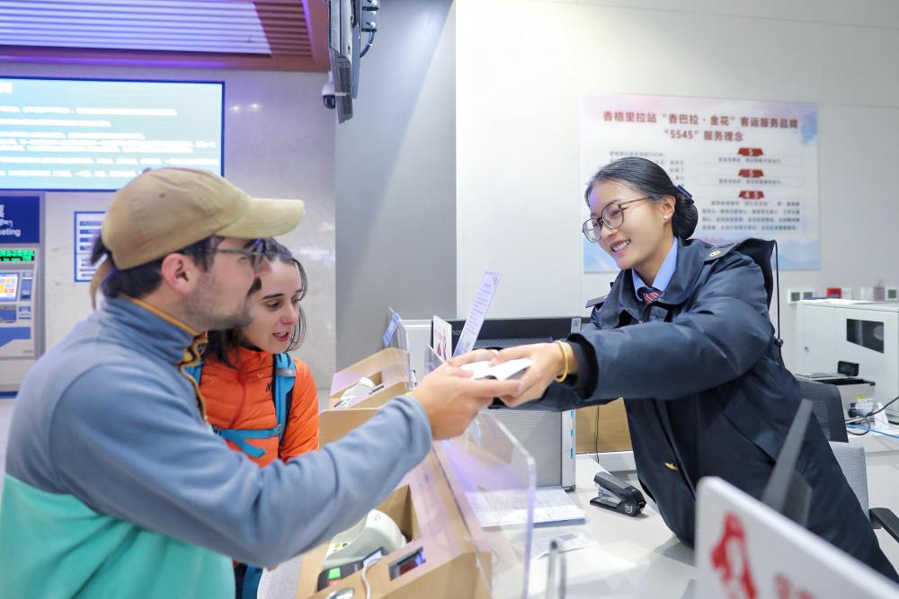 11月18日,外籍旅客在云南香格里拉站“香巴拉·金花”服務(wù)臺(tái)購票。車站為旅客提供“一站式”出行服務(wù)。