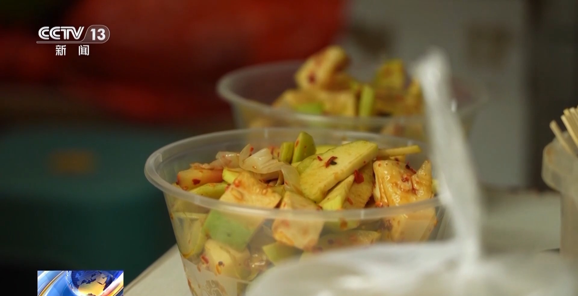 總臺記者 楊雪:街頭巷尾,最具廣西特色的還得是酸嘢,而紅糖酸嘢更是將酸、甜、辣、咸完美融合。將新鮮芒果、菠蘿、番石榴等食材切塊,加入紅糖粉和秘制調(diào)料攪拌均勻,再根據(jù)口味加入辣椒粉,紅糖的蜜甜與水果的清甜結(jié)合,吃起來別有一番風(fēng)味。