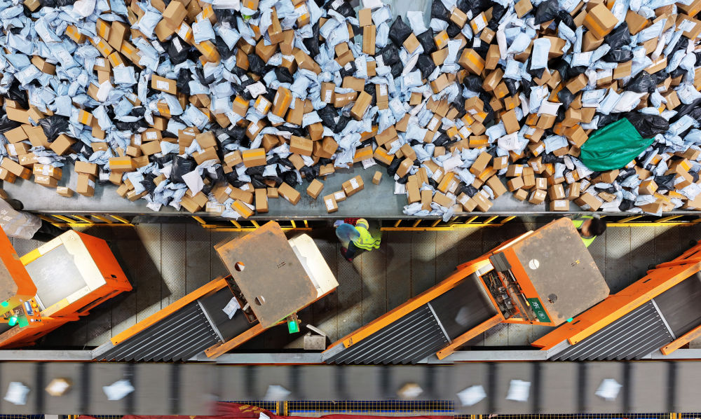 2025年11月10日,在中國(guó)郵政集團(tuán)有限公司江蘇揚(yáng)州郵件處理中心,工作人員分揀快遞包裹(無人機(jī)照片)。新華社發(fā)(孟德龍攝)