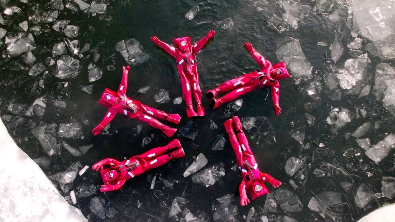 12月5日,在阿勒泰市阿葦灘鎮(zhèn),不少游客身著紅色特制防寒服,在阿勒泰冰浮俱樂部體驗冰浮項目。張福新攝