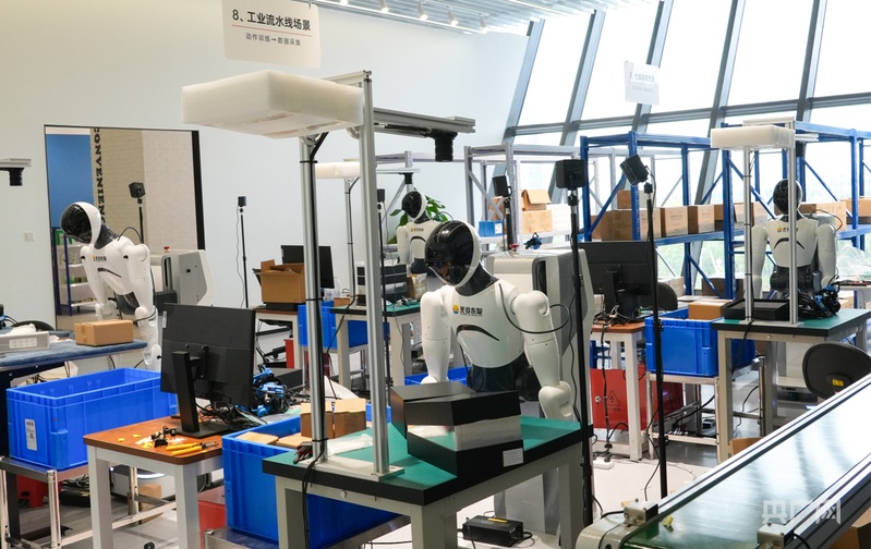 人形機(jī)器人在工業(yè)流水線場(chǎng)景中進(jìn)行動(dòng)作訓(xùn)練(央廣網(wǎng)記者鄧子依 攝)