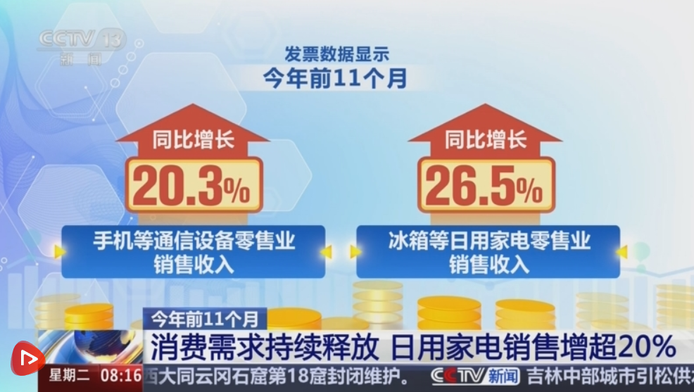 國家稅務總局12月8日舉行新聞發(fā)布會。最新稅收數(shù)據(jù)顯示,2025年以來,在消費品以舊換新等政策帶動下,消費需求持續(xù)釋放。家電、新能源汽車等產(chǎn)品銷售保持較快增長,文旅、體育等領(lǐng)域也呈現(xiàn)較高消費熱度。