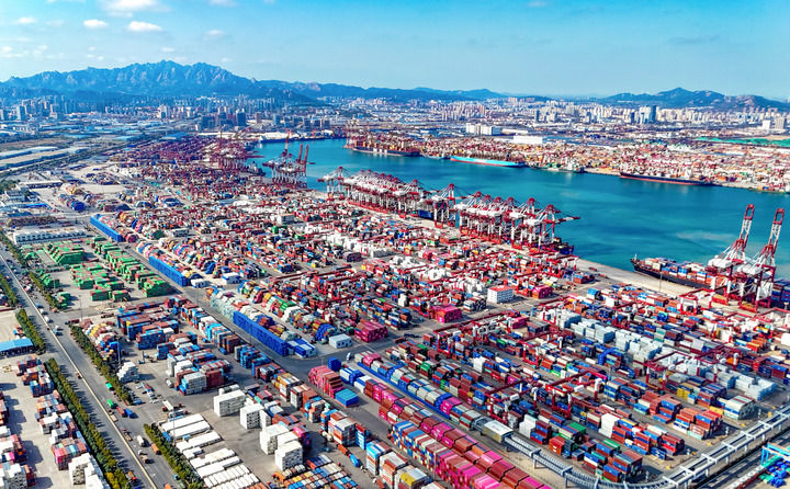 貨輪在青島自貿(mào)片區(qū)裝卸貨物(2025年11月5日攝,無(wú)人機(jī)照片)。新華社發(fā)(張進(jìn)剛攝)