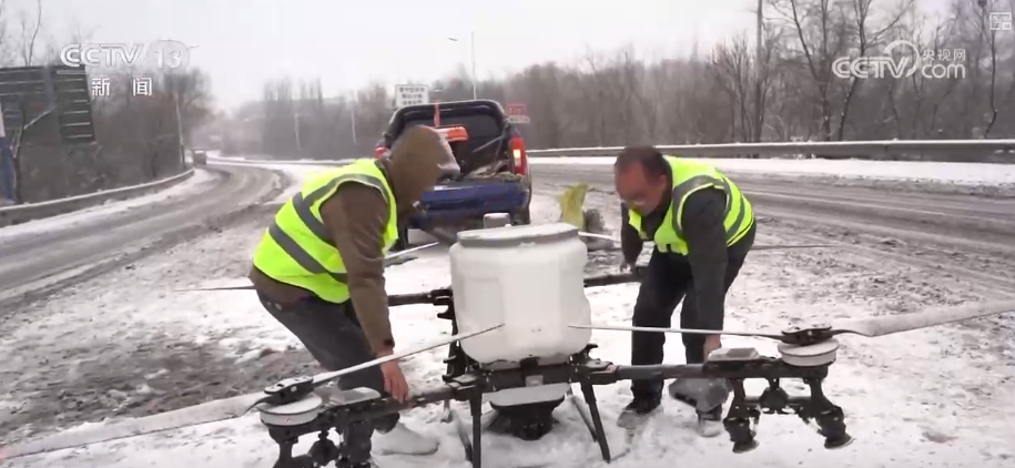 降雪致交通受阻 無(wú)人機(jī)大型機(jī)械撒鹽除雪