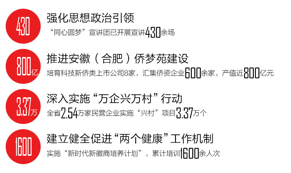 堅持和落實“兩個毫不動搖”,建立健全促進“兩個健康”工作機制。持續(xù)優(yōu)化民營經(jīng)濟發(fā)展環(huán)境,促進經(jīng)濟社會高質量發(fā)展。召開全省民營經(jīng)濟統(tǒng)戰(zhàn)工作會議,明確36項重點任務和55家責任單位,建立13家省直單位組成的聯(lián)席會議制度。聚焦凝心鑄魂,全省統(tǒng)戰(zhàn)系統(tǒng)累計開展理想信念教育和經(jīng)濟形勢政策教育808場次,覆蓋3.82萬人次民營經(jīng)濟人士。突出年輕一代培育,實施“新時代新徽商培養(yǎng)計劃”,累計培訓1600余人次,建立約2500人的代表人士數(shù)據(jù)庫,推動青年商會組織省市全覆蓋,推薦4300余名優(yōu)秀青年企業(yè)家進入各級人大、政協(xié)。引導企業(yè)履行社會責任,完成光彩事業(yè)發(fā)起實施30周年相關調研及先進典型推薦宣傳工作。