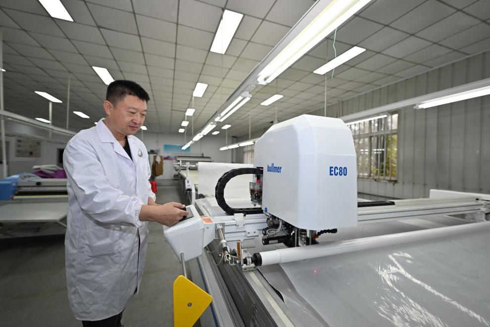 工人在天津紡織集團(控股)有限公司智能化生產(chǎn)車間內(nèi)操作自動切布機。新華社記者孫凡越 攝