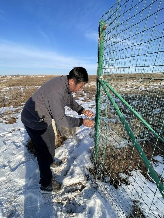 高萬東在修復(fù)損壞的長城保護(hù)圍欄。新華社發(fā)