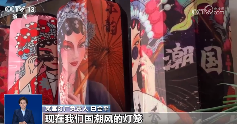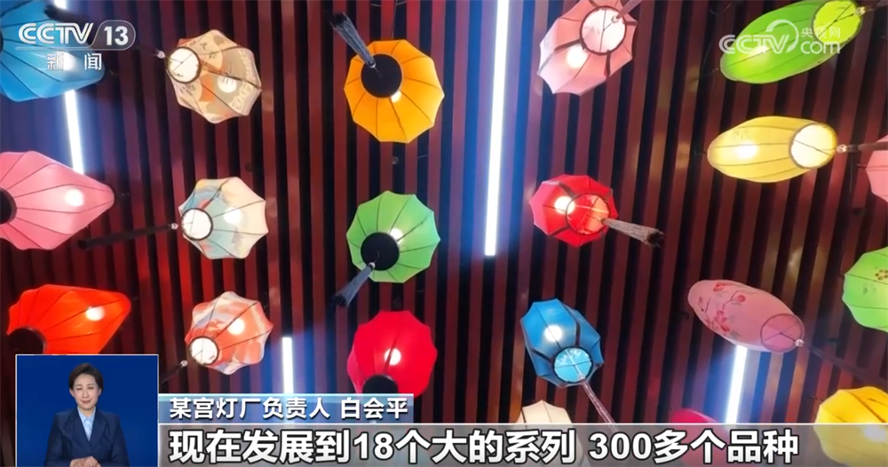 某宮燈廠負責人 白會平:通過跟大專院校合作,研發(fā)新的產品,每年都得有一個新的突破。現在我們國潮風的燈籠特別受年輕消費群體的喜歡。原來我們是單一的幾個品種,現在發(fā)展到18個大的系列、300多個品種,而且根據客戶的要求還可以量身定做。