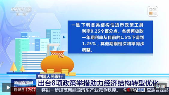 一是下調(diào)各類結(jié)構(gòu)性貨幣政策工具利率0.25個(gè)百分點(diǎn)。各類再貸款一年期利率從目前的1.5%下調(diào)到1.25%,其他期限檔次利率同步調(diào)整。