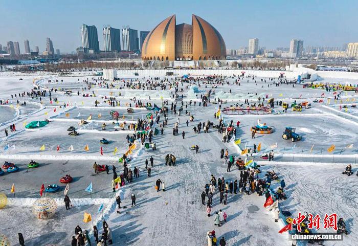 1月1日,市民和游客在新疆昌吉市“絲路冰城”冰雪大世界游玩。(無人機(jī)照片) 何龍 攝
