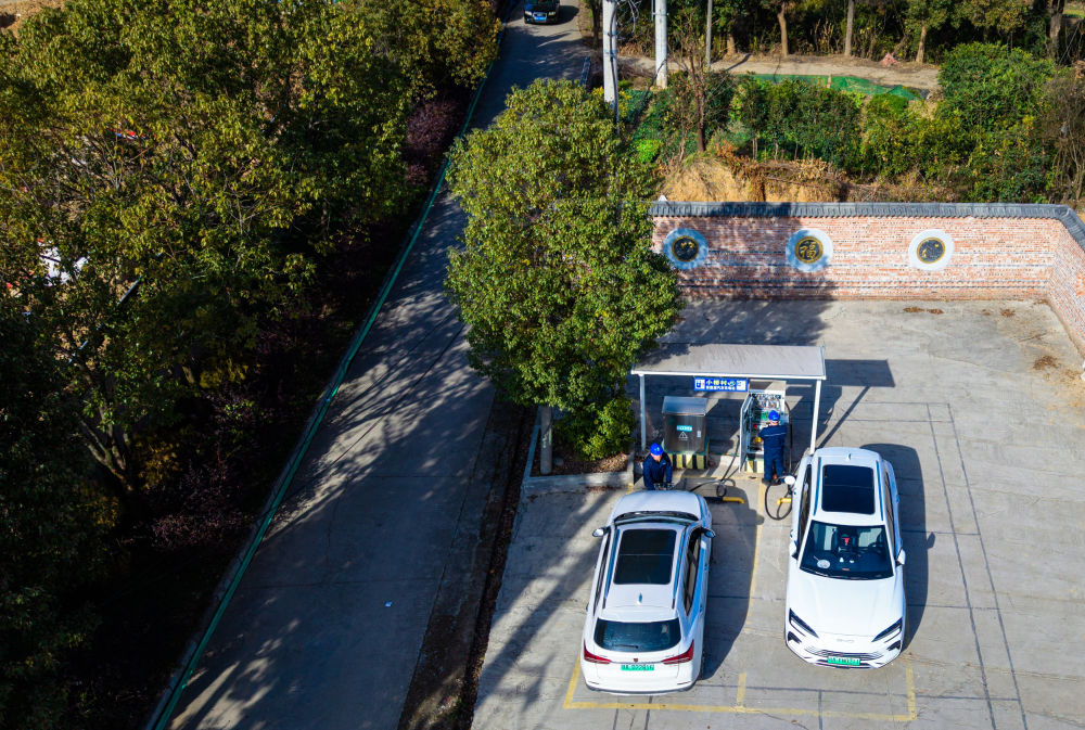 2026年1月11日,國網(wǎng)鄂州供電公司工作人員對鄂州市鄂城區(qū)西山街道小橋村充電站的充電設備進行巡檢(無人機照片)。新華社記者 肖藝九 攝