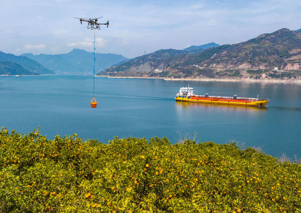 2025年3月17日,湖北省秭歸縣郭家壩鎮(zhèn)鄧家坡村村民用無人機轉運臍橙(無人機照片)。新華社發(fā)(鄭家裕攝)