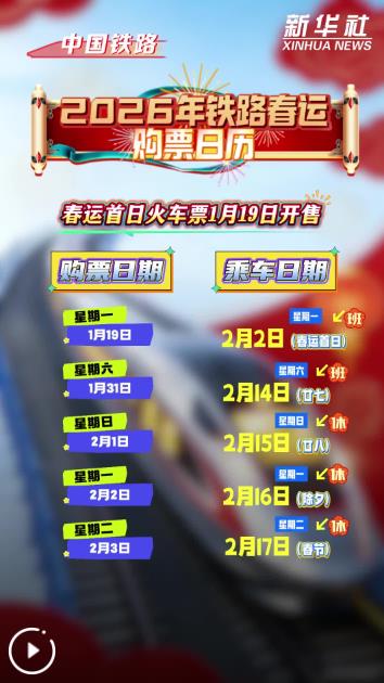 記者1月18日從中國國家鐵路集團有限公司獲悉,2026年鐵路春運自2月2日開始,至3月13日結束,為期40天,全國鐵路預計發(fā)送旅客5.39億人次,節(jié)前客流高峰日預計為2月13日(臘月廿六),節(jié)后客流高峰日預計為2月23日(正月初七),春運首日火車票將于1月19日開始發(fā)售。