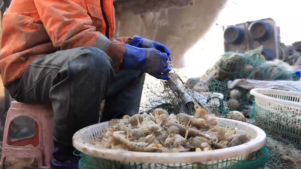 在無(wú)棣縣埕口鎮(zhèn),漁民清晨便駕船出海。隨著漁網(wǎng)收起,一只只活蹦亂跳的琵琶蝦躍上甲板。漁民隨即進(jìn)行分揀、清洗和裝筐。