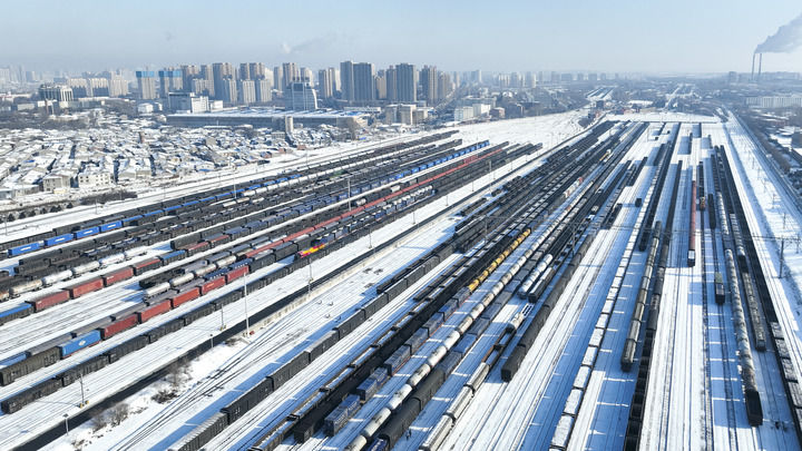 裝滿物資的貨運(yùn)列車在黑龍江省哈爾濱南站編組站場(chǎng)整裝待發(fā)?!叭拧碧煲詠?lái),針對(duì)北方降溫降雪天氣,中國(guó)鐵路哈爾濱局集團(tuán)有限公司哈爾濱南站積極開(kāi)展電煤、生產(chǎn)物資保供專項(xiàng)行動(dòng),全力保障民生物資運(yùn)輸需求(2026年1月15日攝,無(wú)人機(jī)照片)。新華社發(fā)(原勇 攝)