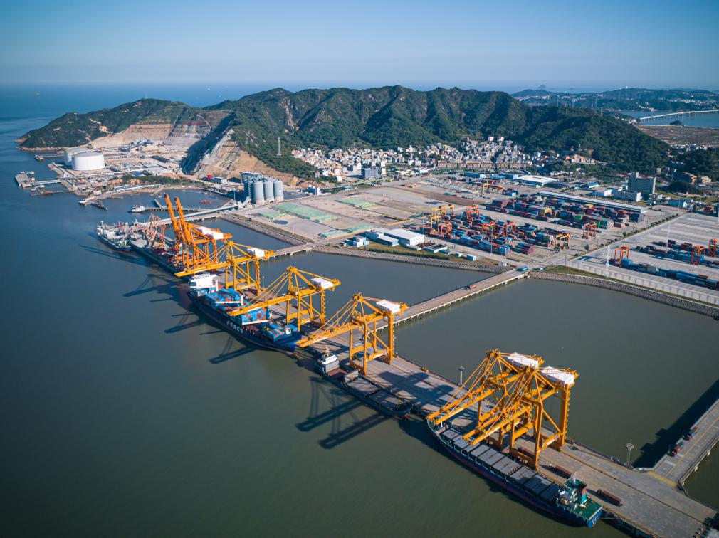 貨輪??吭跍刂莞蹱钤b箱碼頭卸載集裝箱(無人機(jī)照片)。新華社記者江漢 攝