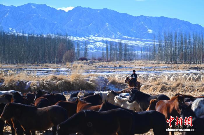 寒冬時(shí)節(jié),中新社、中新網(wǎng)記者走進(jìn)甘肅省酒泉市肅北縣黨城灣鎮(zhèn)浩布勒格村,該村年輕的養(yǎng)馬人其烏摳每天騎馬去草場(chǎng)給馬匹拉水、投喂飼料。閑暇時(shí),他還會(huì)使用無(wú)人機(jī)觀察馬匹的動(dòng)態(tài)行蹤,通過(guò)網(wǎng)絡(luò)平臺(tái)分享自家馬兒的視頻。