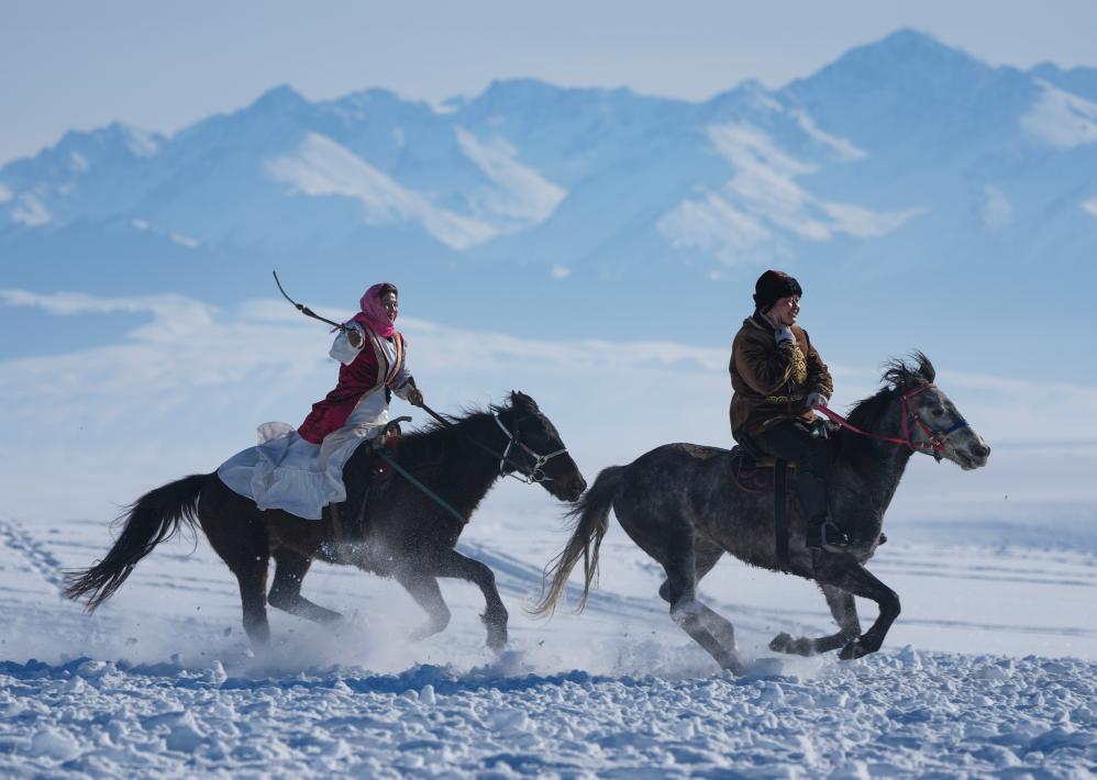 西陲天山,雪峰逶迤。被譽為“天馬故鄉(xiāng)”的新疆伊犁昭蘇縣,在南腔北調(diào)的歡呼聲中,演員們騎馬行進在銀裝素裹的濕地公園,載歌載舞表演牧區(qū)傳統(tǒng)婚禮。興之所起,游客與演員共舞一曲,熱鬧非凡。