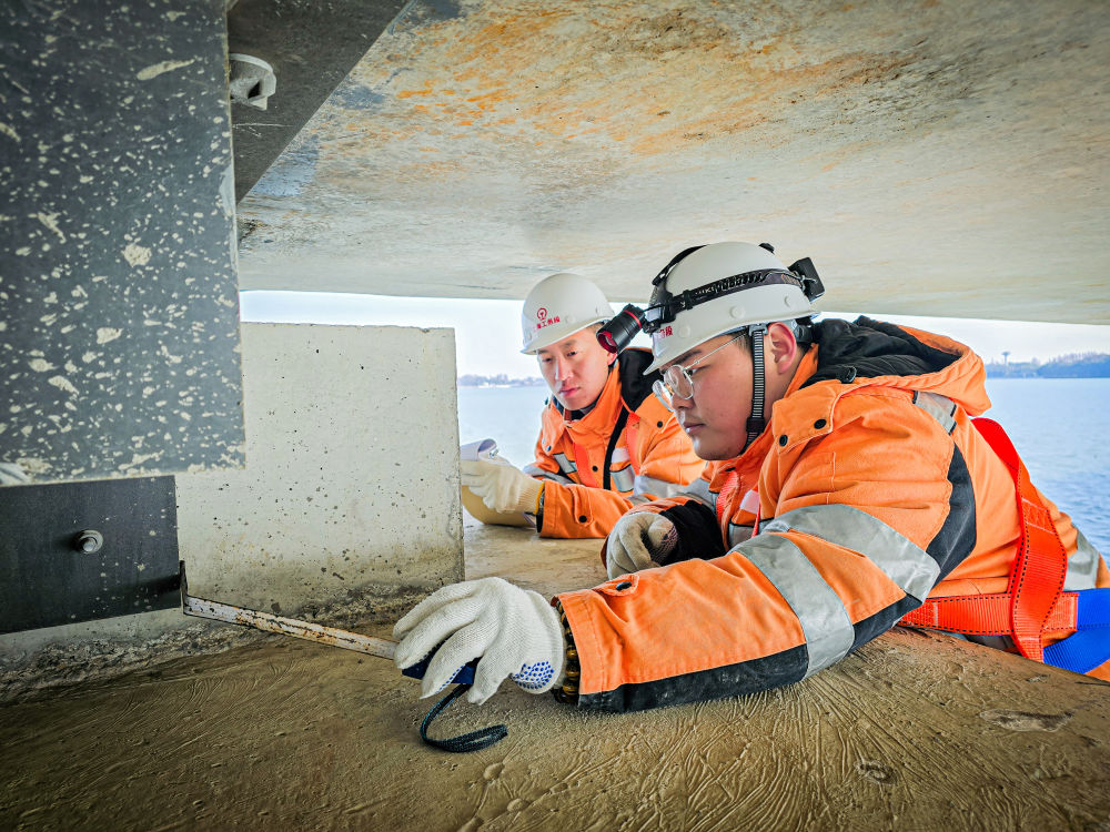 橋體間的縫隙狹窄,進入大橋內部后更是伸手不見五指。上海高鐵基礎設施段湖州車間橋梁組工作人員借著頭燈的光線,像啄木鳥為樹木問診一般,沿梁體一路進行聽診式的檢查。