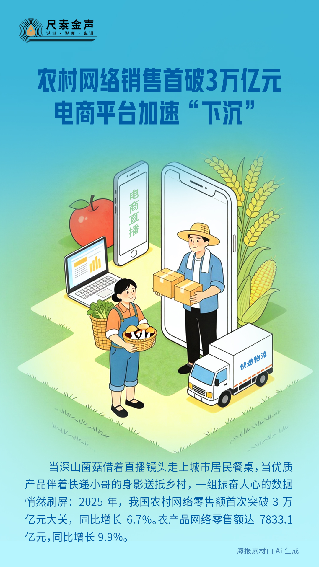 當(dāng)深山菌菇借著直播鏡頭走上城市居民餐桌,當(dāng)優(yōu)質(zhì)產(chǎn)品伴著快遞小哥的身影送抵鄉(xiāng)村,一組振奮人心的數(shù)據(jù)悄然刷屏:2025年,我國農(nóng)村網(wǎng)絡(luò)零售額首次突破3萬億元大關(guān),同比增長6.7%。農(nóng)產(chǎn)品網(wǎng)絡(luò)零售額達(dá)7833.1億元,同比增長9.9%。