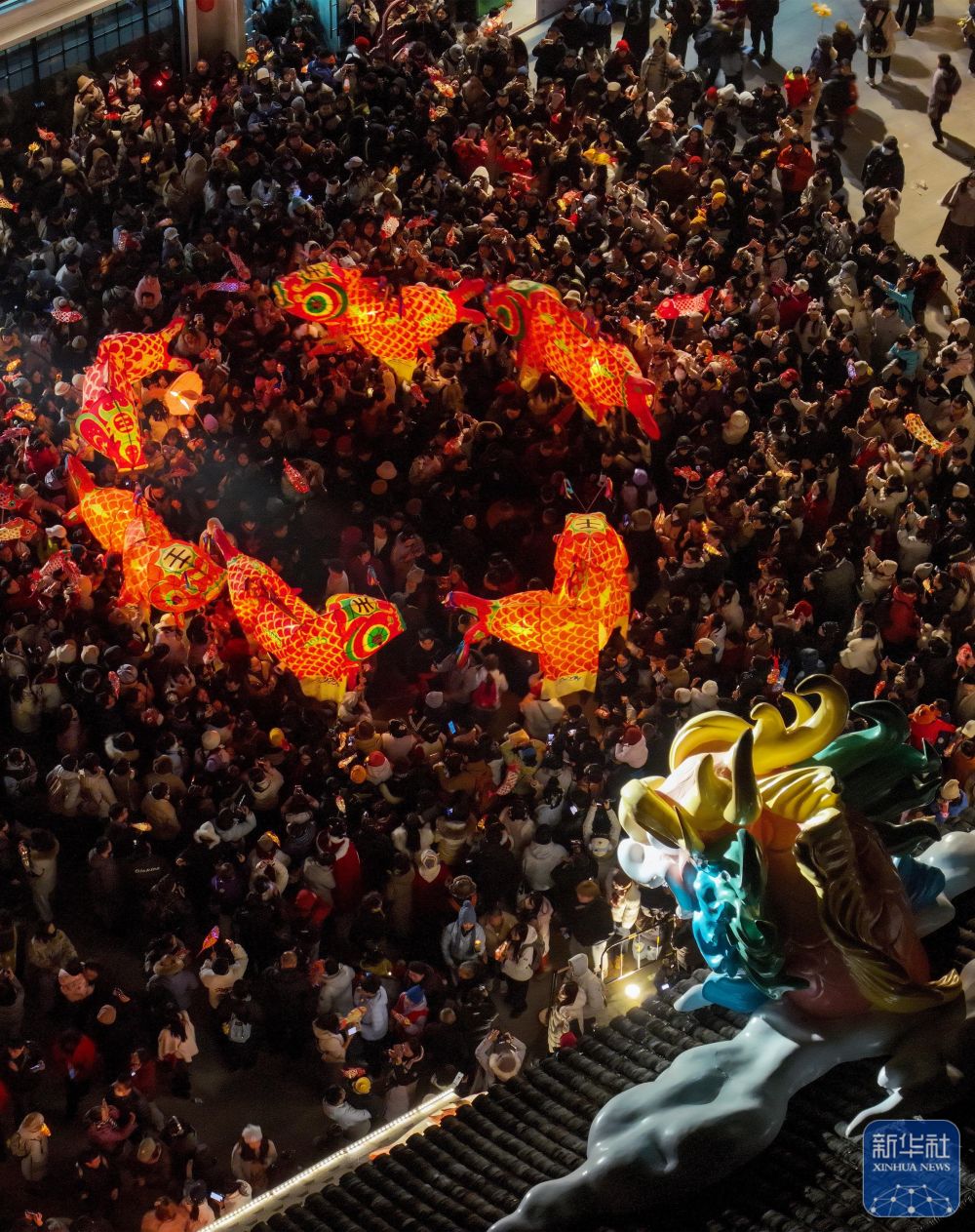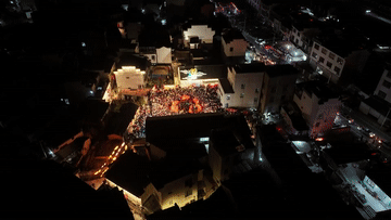 2月7日,瞻淇村魚(yú)燈隊(duì)在村中表演(無(wú)人機(jī)照片)。