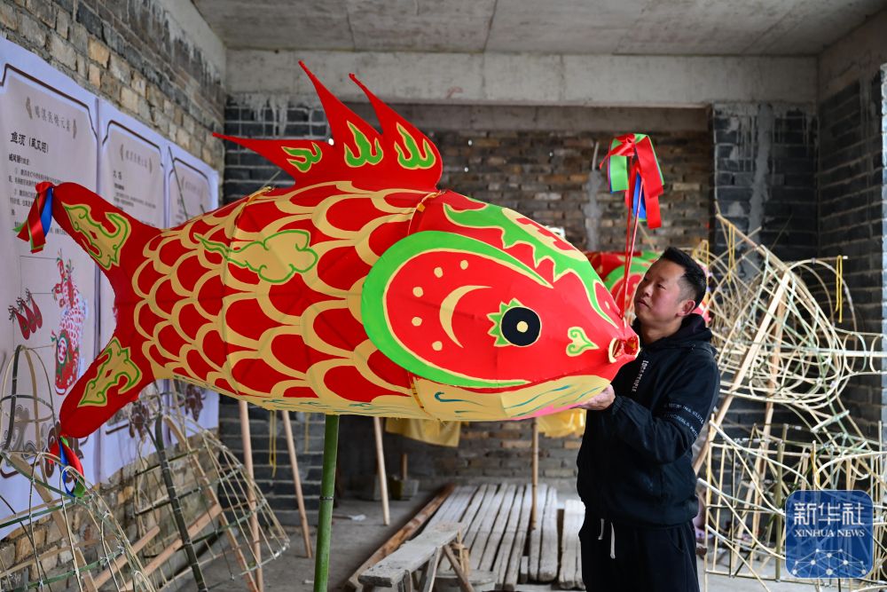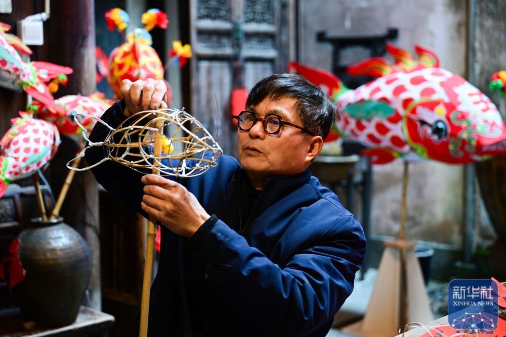 1月29日,瞻淇村的市級(jí)非遺項(xiàng)目魚(yú)燈代表性傳承人汪近午在制作魚(yú)燈。