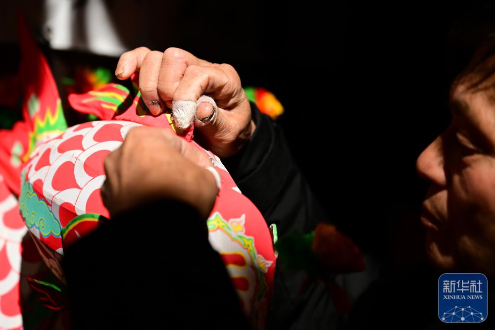 2月8日,瞻淇村的市級(jí)非遺項(xiàng)目魚(yú)燈代表性傳承人汪近午在制作魚(yú)燈。他的手指因長(zhǎng)年制作魚(yú)燈而纏上了膠布。