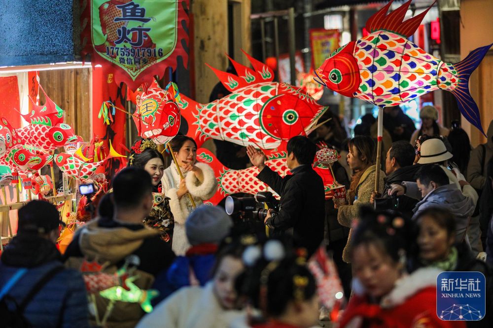 2月7日,游客在瞻淇村和魚(yú)燈合影。