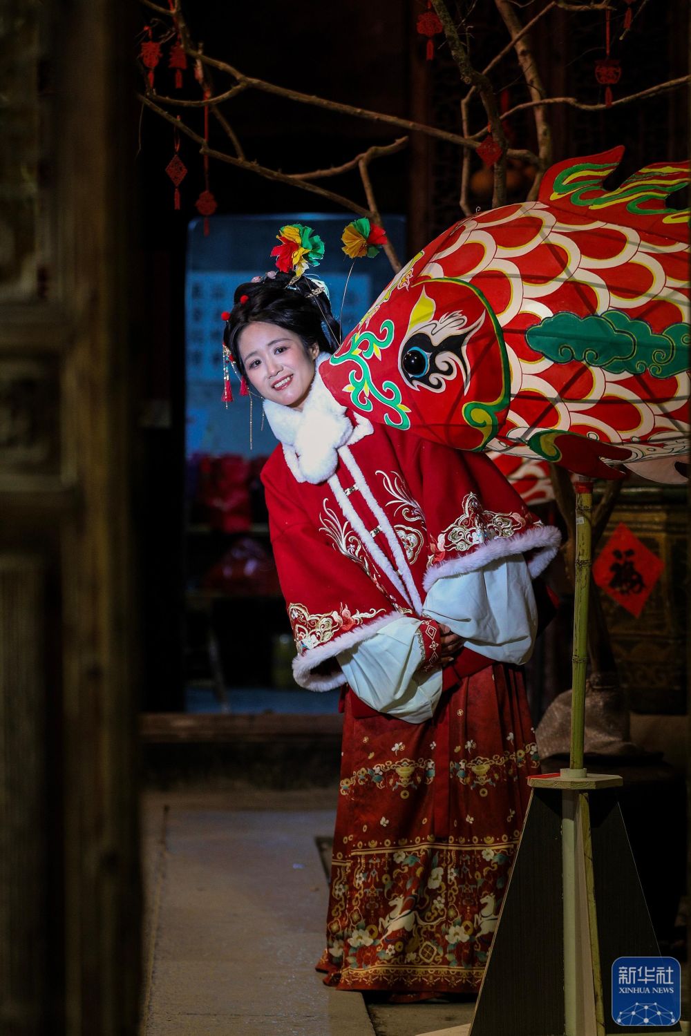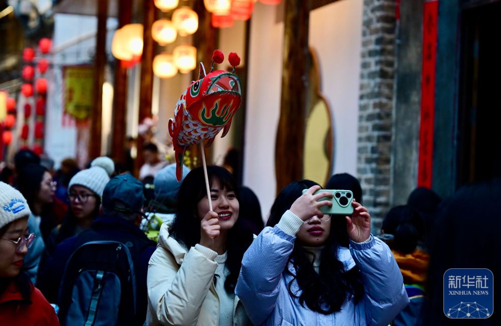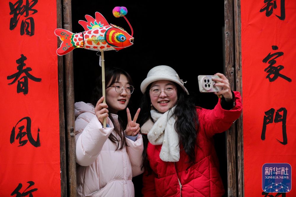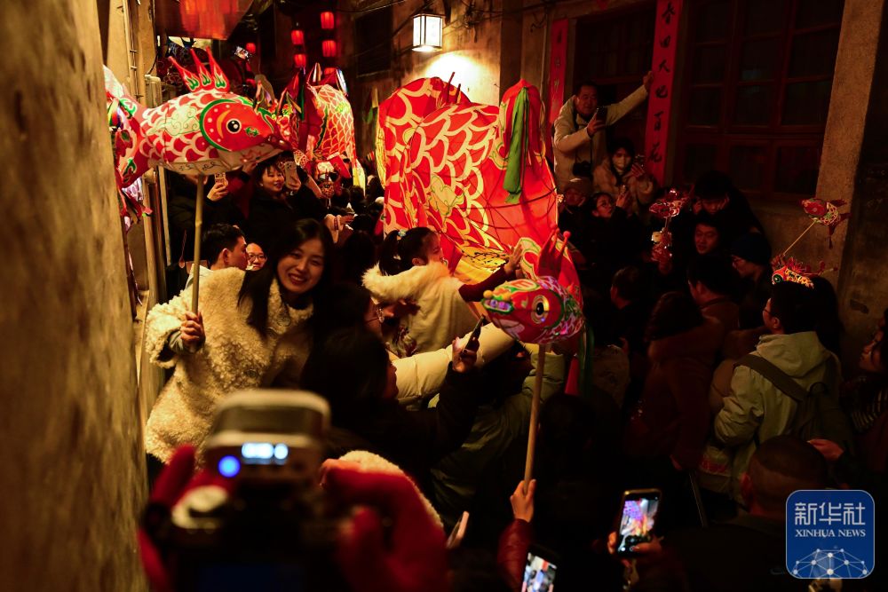 2月7日,游客在瞻淇村里體驗(yàn)魚(yú)燈表演。
