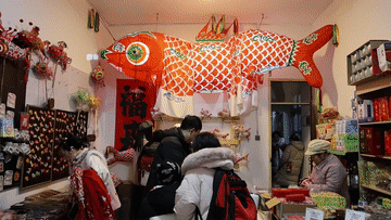 1月29日,在瞻淇村一處店鋪內(nèi),工作人員展示售賣(mài)的魚(yú)燈冰箱貼。